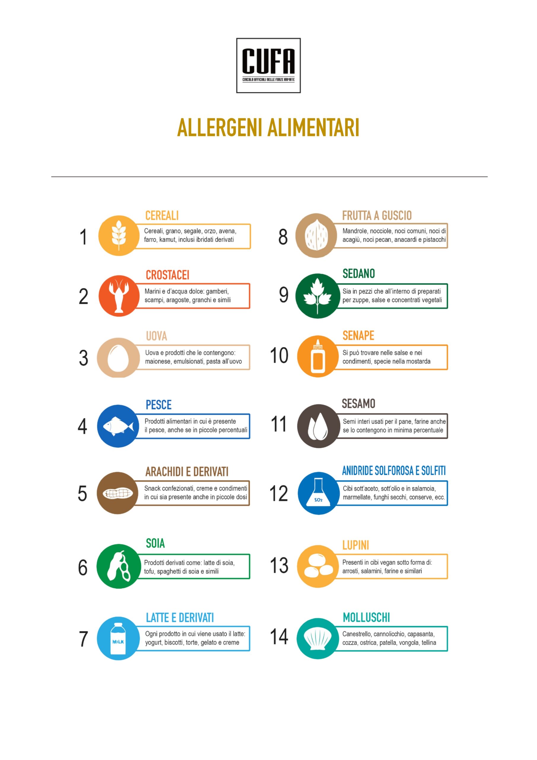 I numeri accanto ad ogni piatto si riferiscono agli allergeni alimentari presenti. L’asterisco ai prodotti surgelati all’origine. Clicca qui per la tabella completa